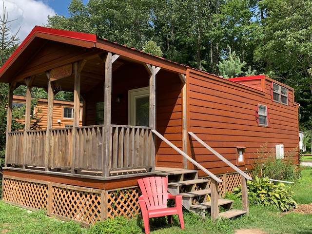 For those who desire to have all the modern conveniences of home while camping, the Royal Coachman cabin is the place for you. This home-away-from-home is beautifully furnished with a cozy electric fireplace in the living room, which also has a flat screen cable TV and a comfortable hide-a-bed sofa. Guests have a private full bathroom with shower and regular flush toilet. A Queen size bed and flat screen cable TV can both be found in the master bedroom. The second bedroom has two single bunk beds. Located above the fully equipped kitchen is a spacious loft area for the kids to roll out their sleeping bags or play their favorite games. And lastly, at the front of the cabin, a covered front porch awaits guests as they enjoy the peaceful sounds of the great outdoors.