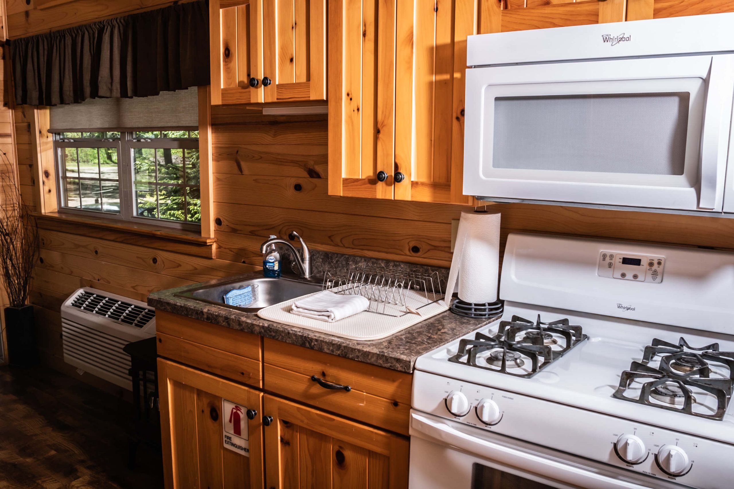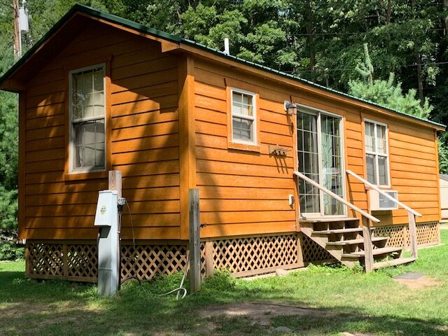 You can’t help but feel that you never left home when you discover all the amenities our Green Drake cabin has to offer. Our Forest Glen is larger in size and features two bedrooms at opposite ends of the unit for maximum privacy. The master bedroom features a Queen size bed and a flat screen TV with cable. The second bedroom has bunk style beds with a double bunk on the bottom – ideal for children. Enjoy your private bathroom with shower and flush toilet. Prepare your favorite full course meals in your fully equipped kitchen. Nestled between the two bedrooms is the living room, which includes a flat screen cable TV and a comfortable hide-a-bed sofa. Enter and exit the cabin through the living room’s double glass sliding doors.