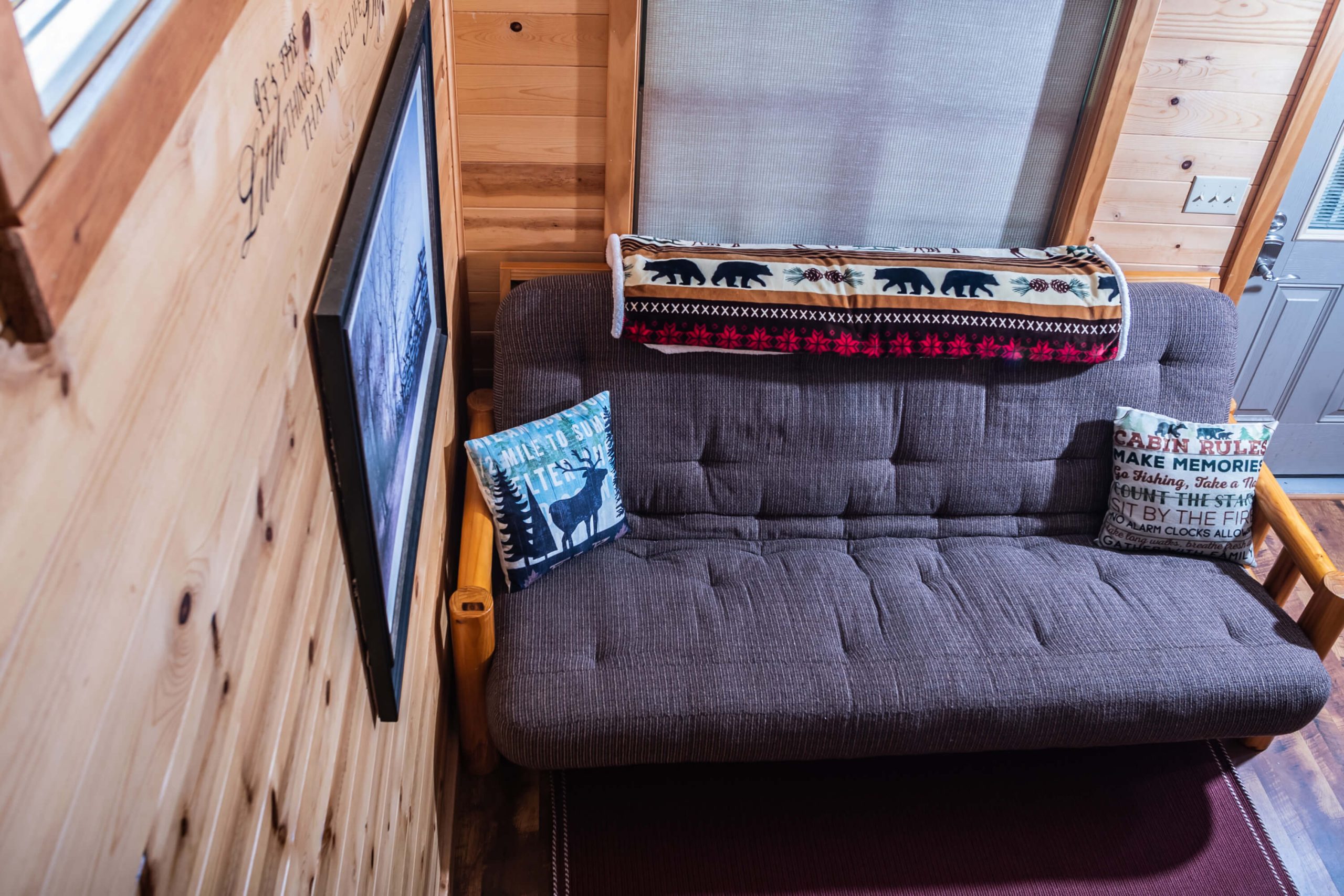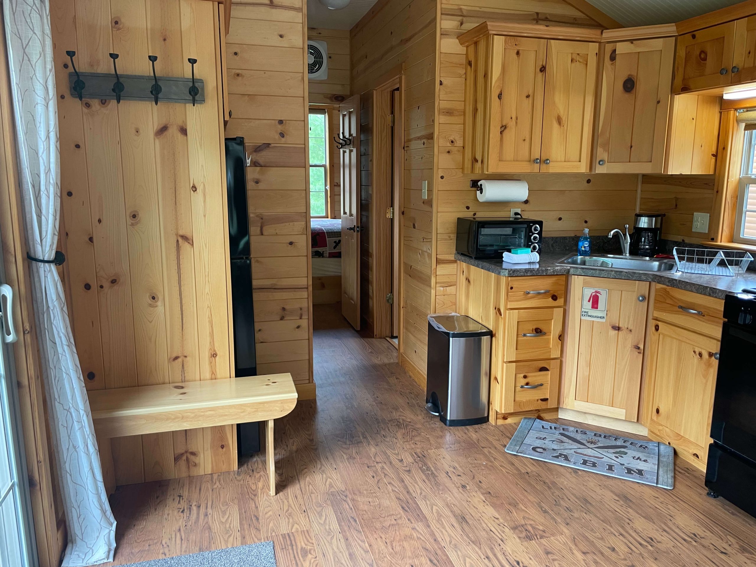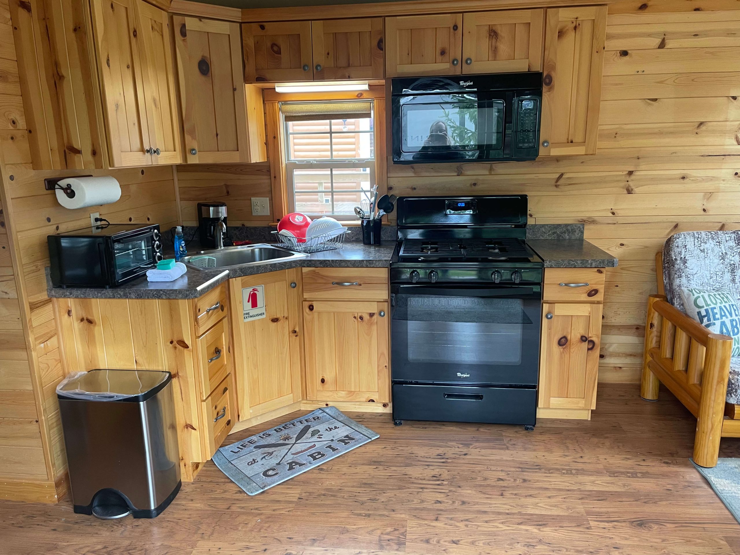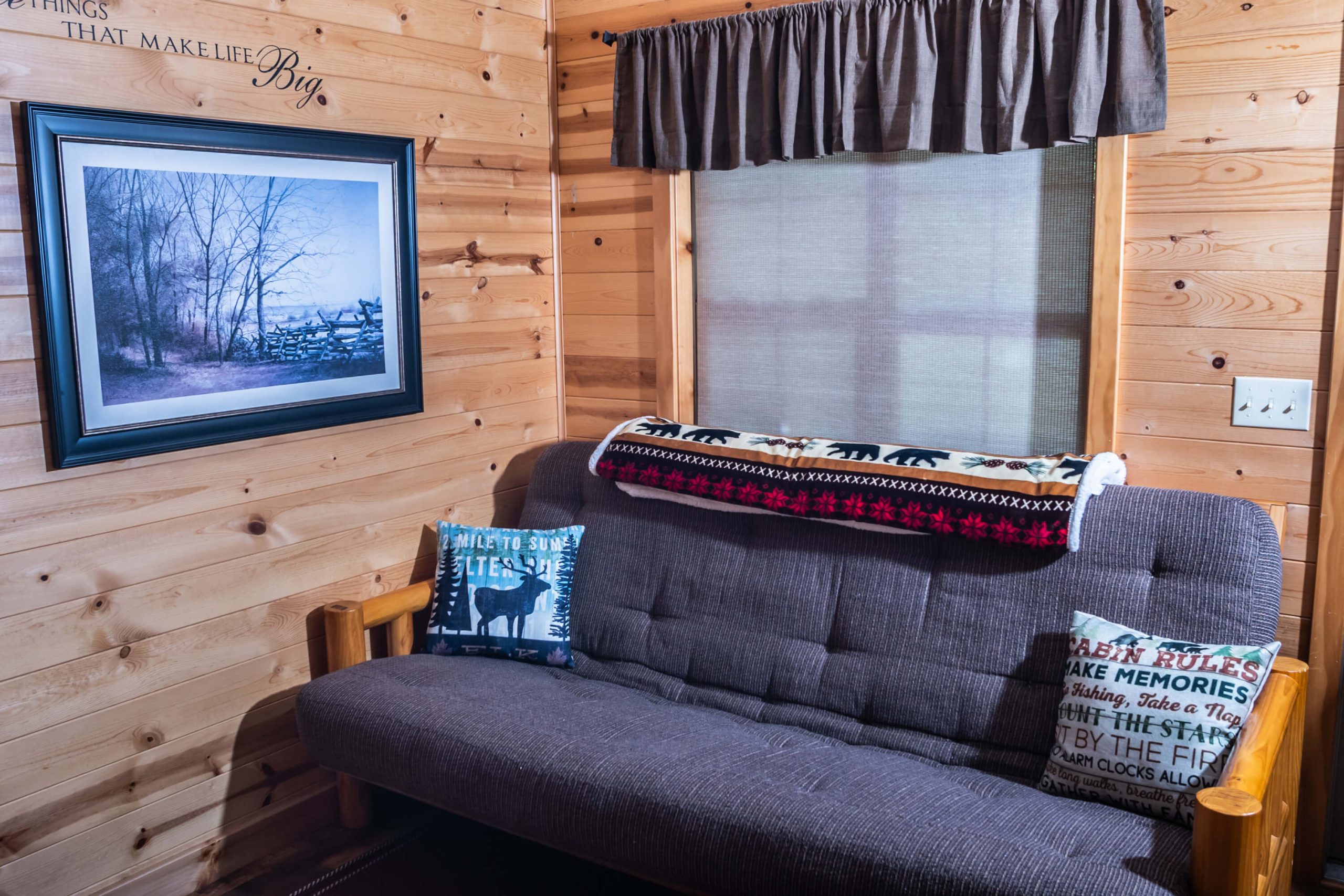 New for 2021 the Quill Gordon is a spacious tastefully appointed extra large one bedroom cabin. This cabin sits on a elevated double site centrally located in the park. The master bedroom has a Queen size bed with a flat screen TV. The bathroom boosts a walk in shower with bench seat. The kitchen is equipped with all the modern conveniences that making your favorite meal a breeze. The living room has a comfortable futon that converts to a bed with a flat screen tv.