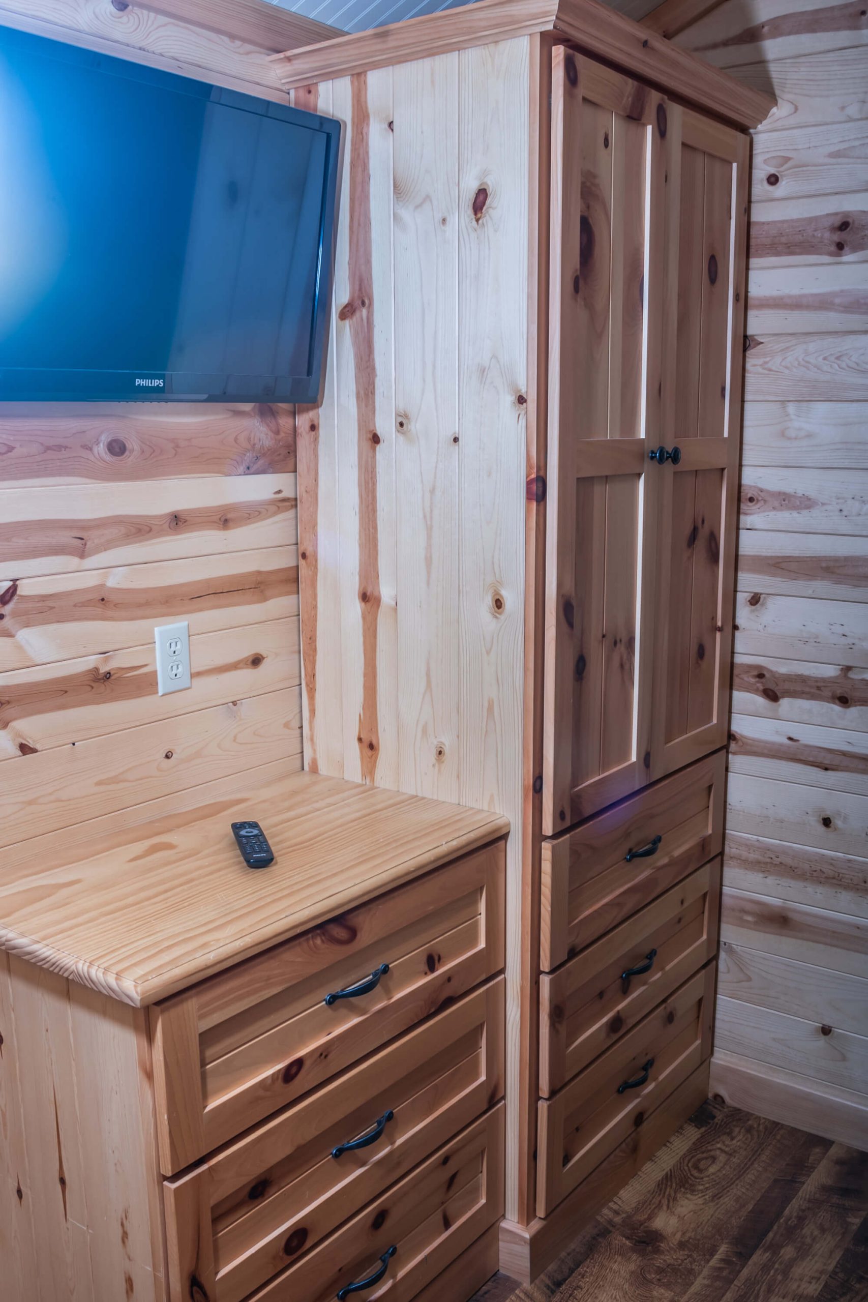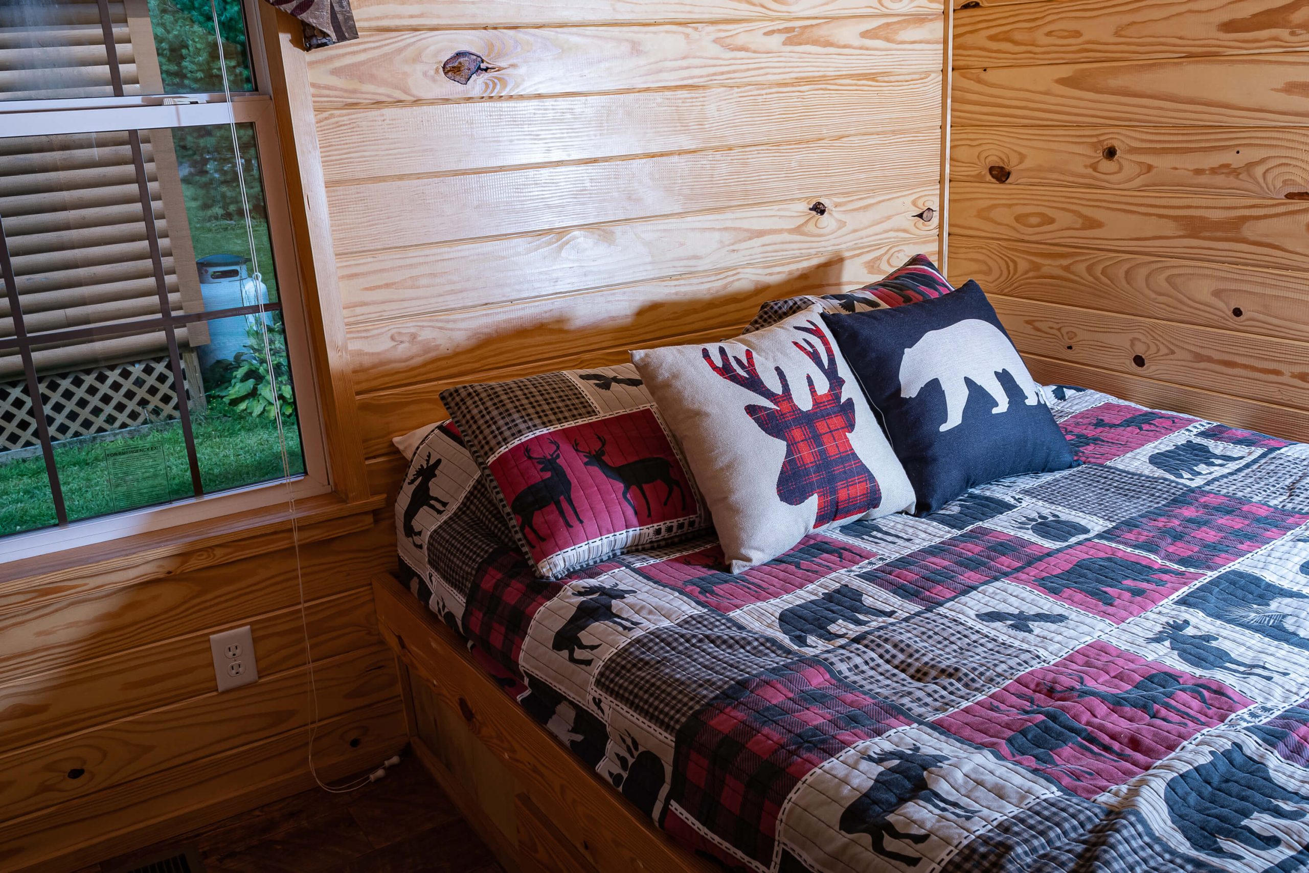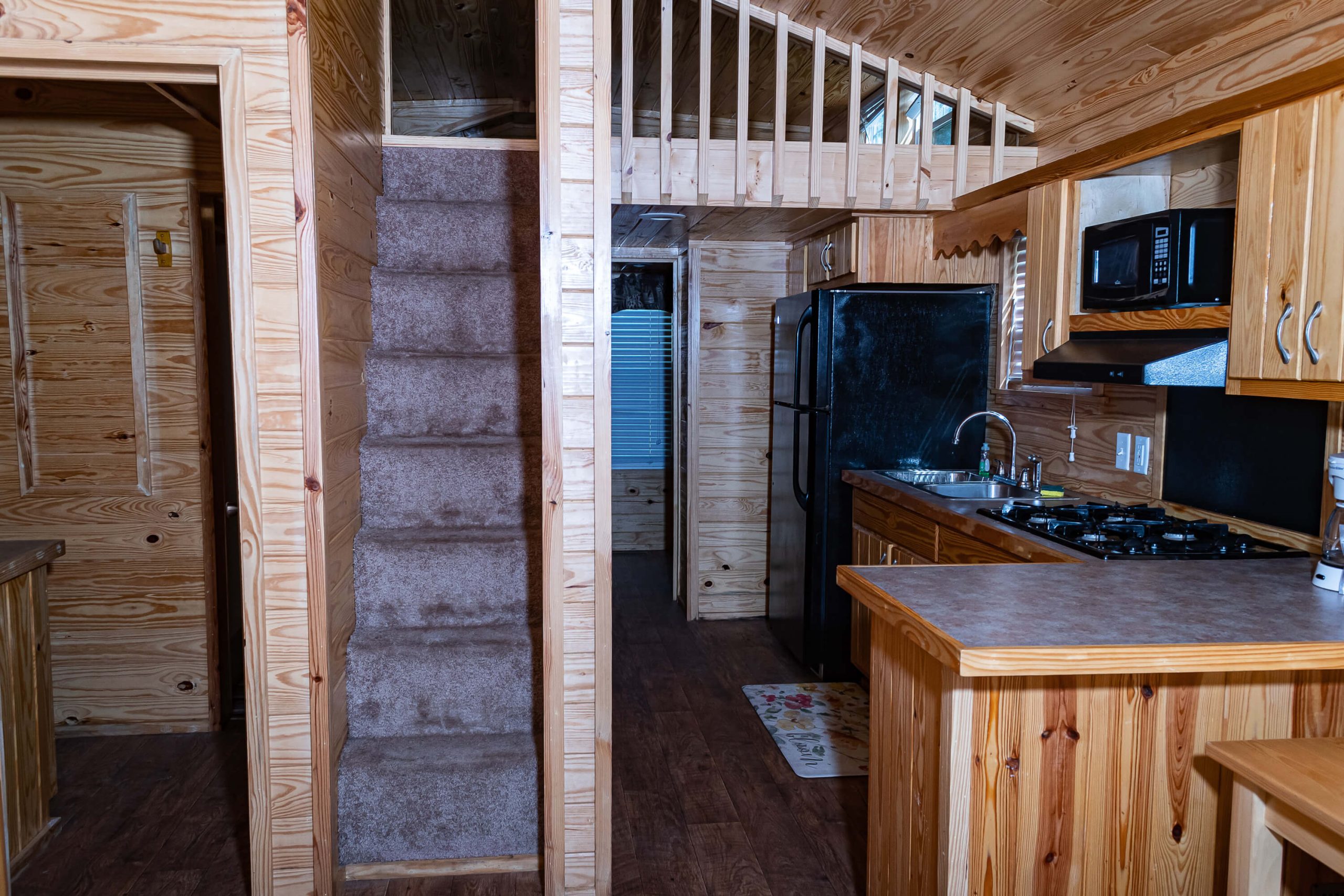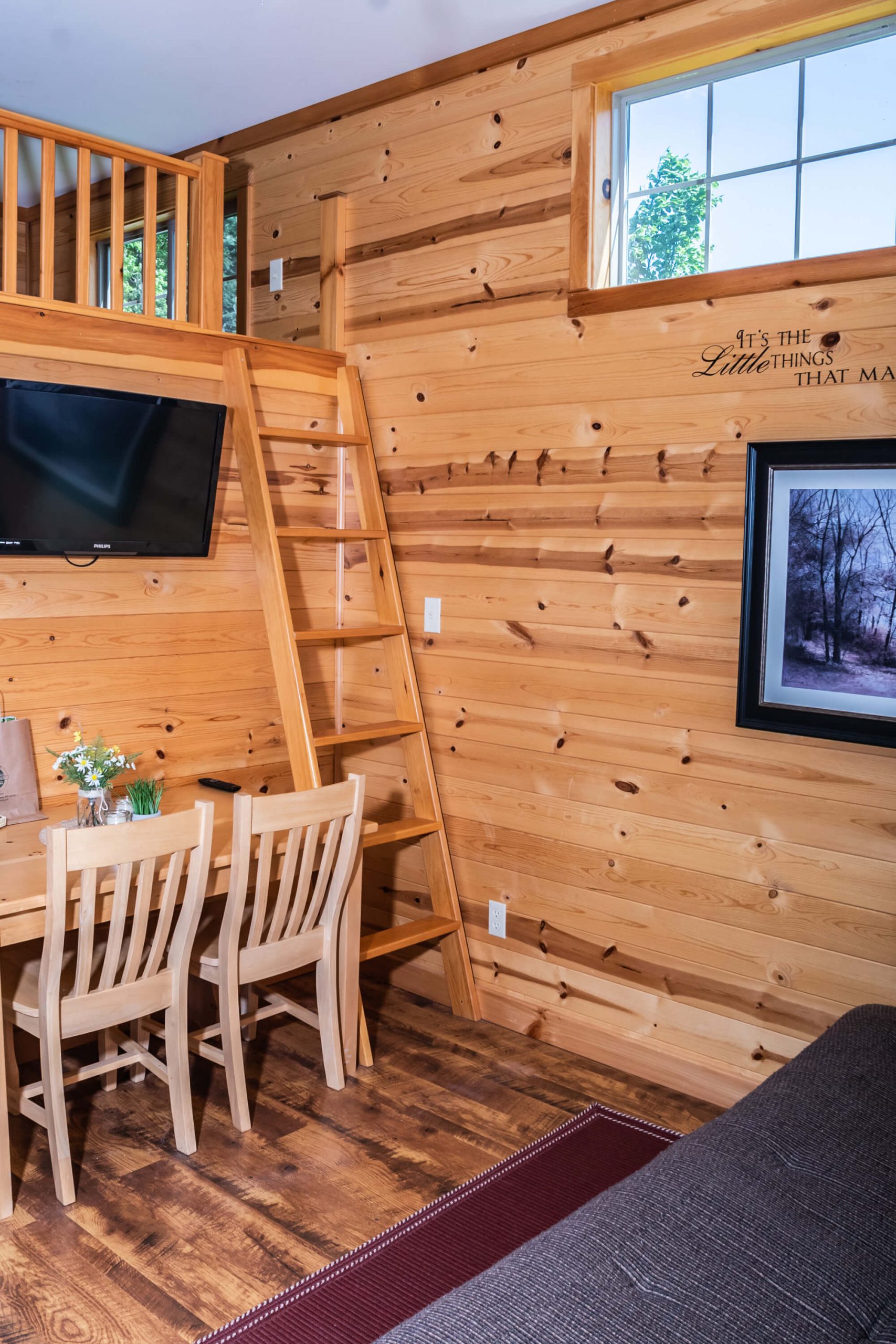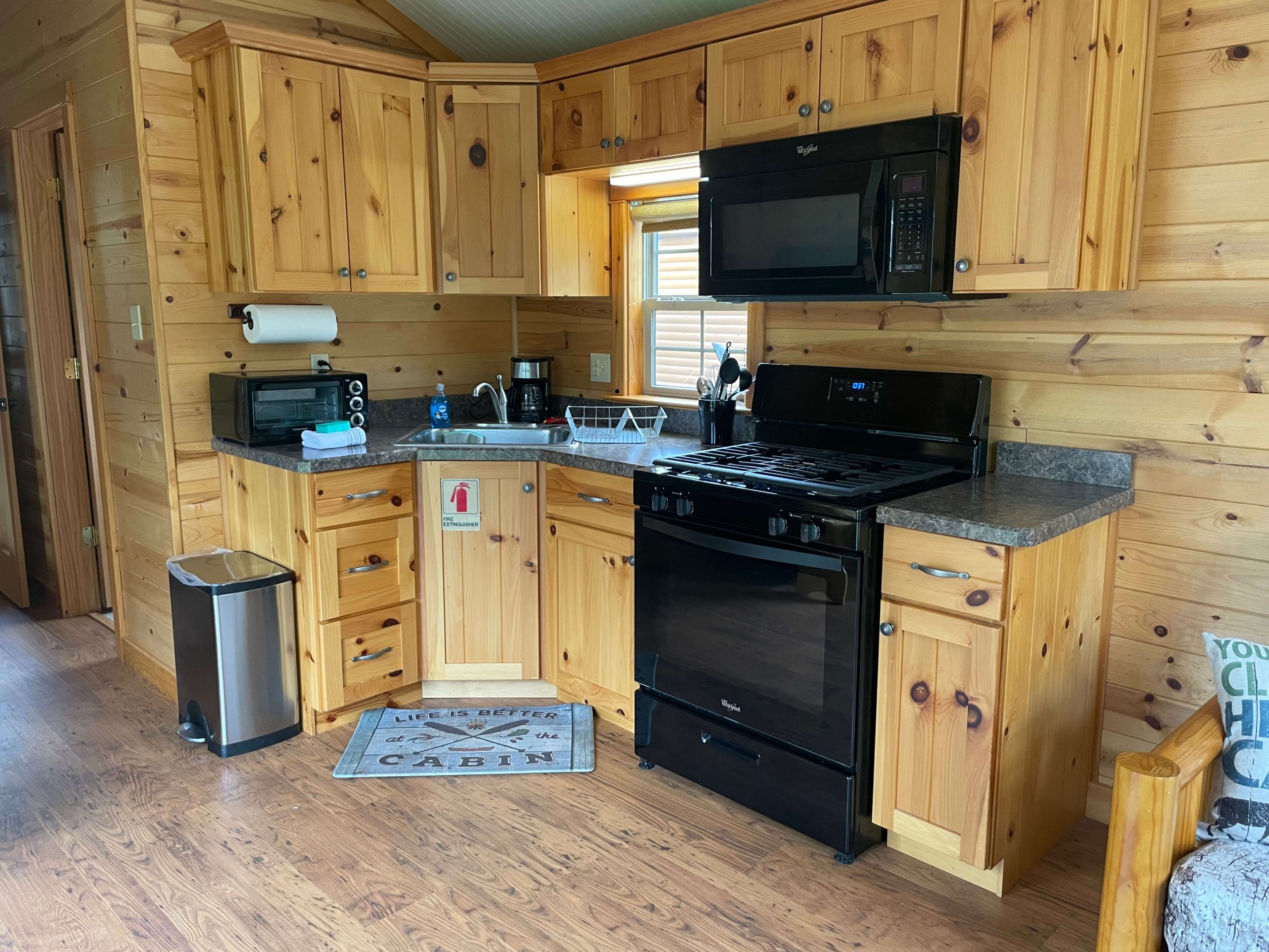 New for 2021 the Quill Gordon is a spacious tastefully appointed extra large one bedroom cabin. This cabin sits on a elevated double site centrally located in the park. The master bedroom has a Queen size bed with a flat screen TV. The bathroom boosts a walk in shower with bench seat. The kitchen is equipped with all the modern conveniences that making your favorite meal a breeze. The living room has a comfortable futon that converts to a bed with a flat screen tv.