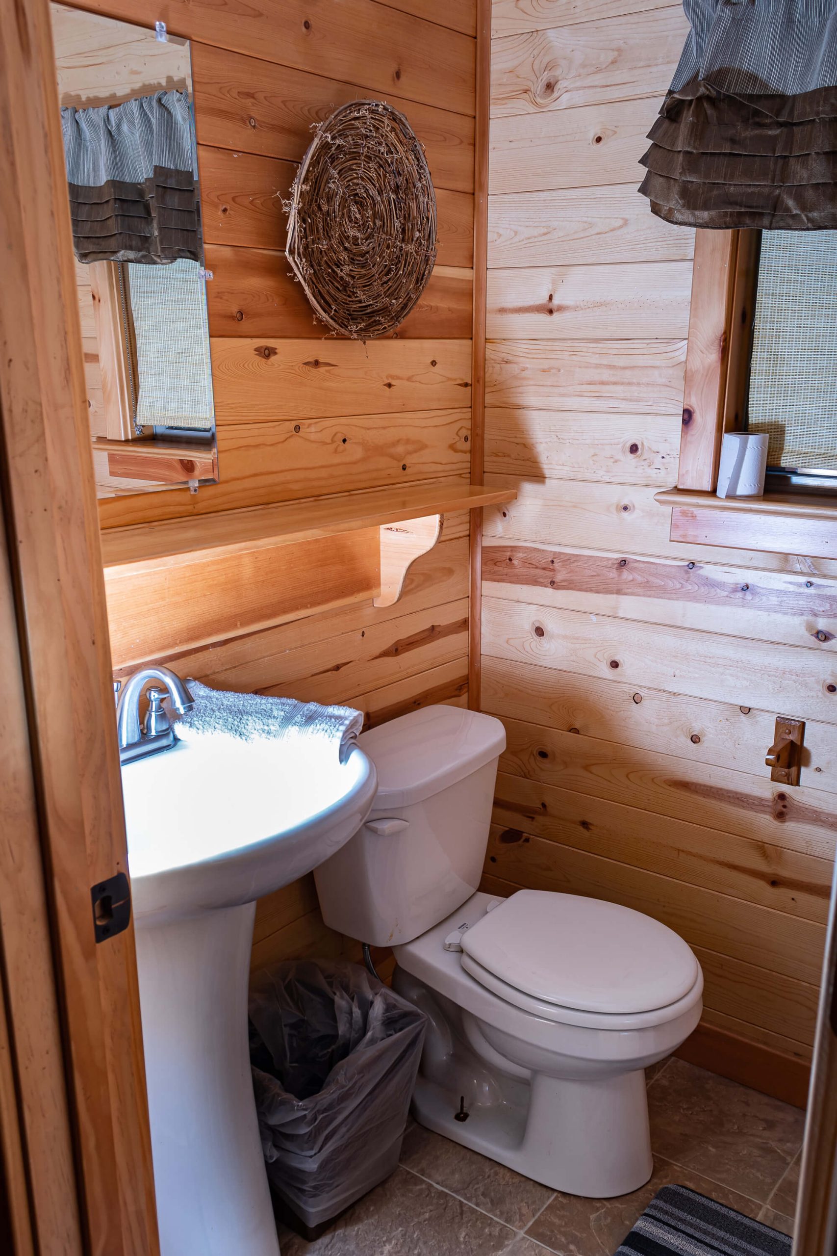 The Cahill Adventure is centrally located in the park. This layout is a family favorite with its bedrooms located on opposite ends of the cabin. Its amenities include a living room with a pull out futon and flat screen cable TV. In the master bedroom, a Queen size bed and flat screen TV are there for you to enjoy. The second bedroom has bunk style beds – ideal for children. Guests can enjoy a private full bathroom with home style flush toilets and large size shower. This location is a favorite to have your evening fire watching out for a shooting star in our spectacular sky’s in our mountain valley.